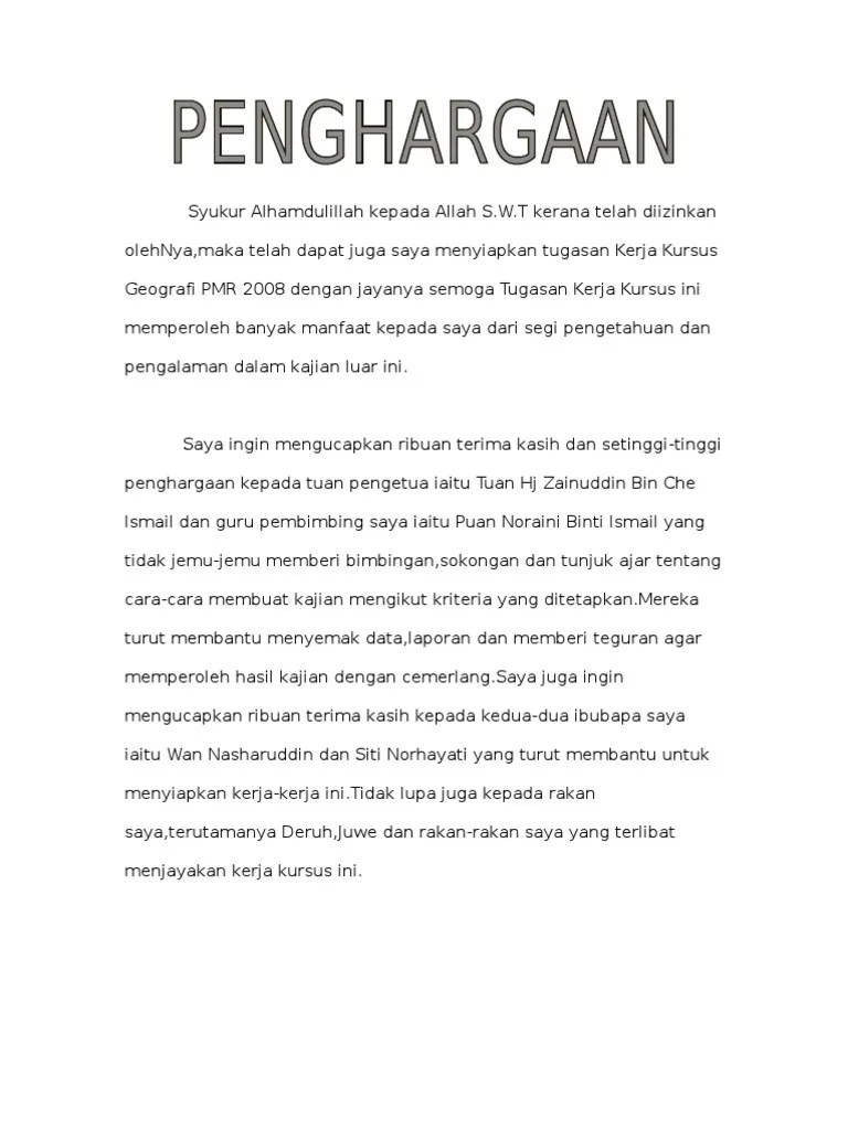 Contoh penghargaan contoh assignment penghargaan contoh penghargaan kerja kursus panduan penghargaan ayat penghargaan contoh ayat rujukan penghargaan. Contoh penulisan penghargaan kerja kursus geografi 2013 penghargaan saya ingin mengucapkan ribuan terima kasih kepada pengetua sekolah menengah kebangsaan . Alhamdulillah , dengan penuh kesyukuran kehadrat ilahi kerana limpah kurnianya , dapat saya menyelesaikan tugasan kerja kursus ini . Penghargaan bersyukur kami ke hadrat ilahi kerana dengan limpah dan kurnianya dapat kami menyiapkan kerja kursus dengan jayanya. Contoh penulisan penghargaan kerja kursus geografi 2013 nur amirah academia edu from 0.academia photos survei ini khusus . Penghargaan sample for folio sejarah ting 3 cute766. Secara langsung atau sebaliknya dalam pembikinan kerja kursus saya ini.